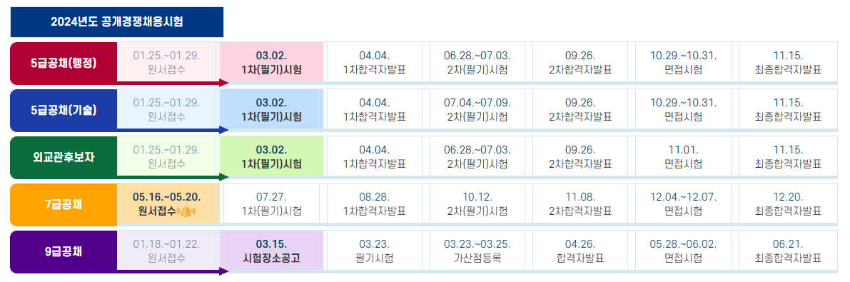 2024년 국가직 9급, 7급, 5급 공개경쟁채용 시험 일정을 안내해드립니다. 올해 시험준비하시는 모든 분들의 합격을 기원합니다.